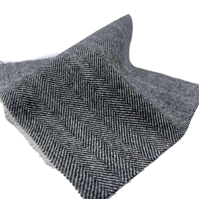 Dette stoffet, betegnet som artikkel ZZH24020, er et jacquardvevet tekstil som består av 50 % ull og 50 % polyester. Med en masse per arealenhet på 460g/m presenterer materialet en middels vekt konstruksjon. Overflaten har et klassisk fiskebeinsmønster i svart og hvitt, skapt gjennom jacquardveveprosessen. Kombinasjonen av ull- og polyesterfibre påvirker stoffets taktile egenskaper og dimensjonsstabilitet. Den vevde strukturen og fiberblandingen bidrar til stoffets draperings- og rynkemotstand. Disse tekniske spesifikasjonene gjør dette jacquardstoffet egnet for skreddersydde klær der mønsterdefinisjon og strukturell integritet kreves