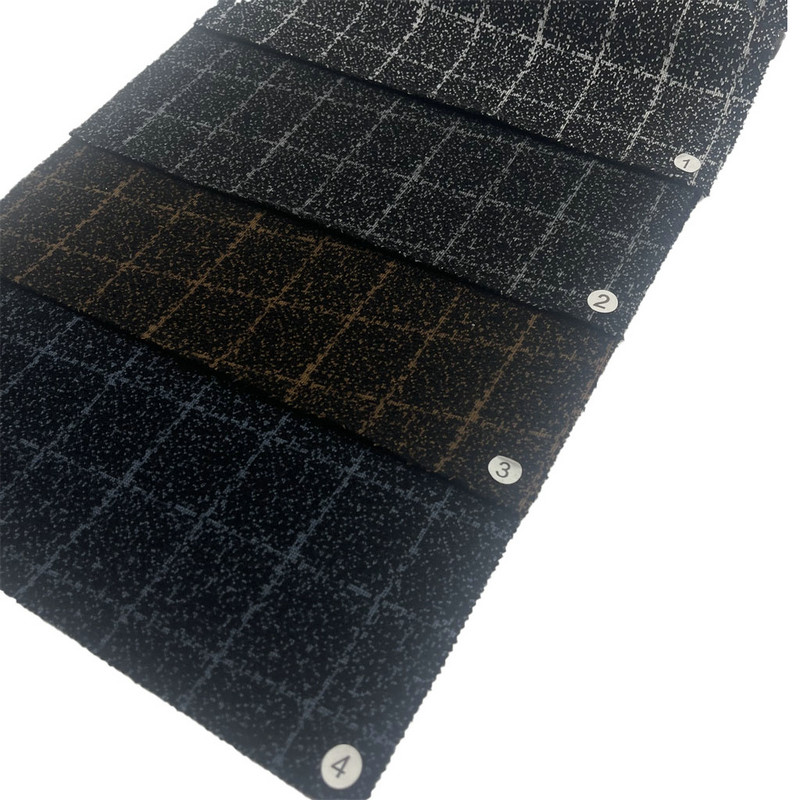 Dette stoffet, artikkel 182808-1, er et strikket tekstil designet for blazerproduksjon. Den er konstruert av en fiberblanding av 65 % polyester, 27 % nylon, 6 % akryl og 2 % ull, med en masse per arealenhet på 820 g/m. Overflaten integrerer et kombinert rutemønster og prikker som dannes under strikkeprosessen. Denne spesifikke fibersammensetningen skaper komplementære egenskaper: polyesteren gir strukturell stabilitet, nylonet øker holdbarheten, akrylen bidrar til luft, og ullen påvirker stoffets håndfølelse. Den betydelige vekten og strikkekonstruksjonen bidrar til stoffets draperings- og isolasjonsegenskaper, noe som gjør det egnet for strukturerte plagg som blazere.