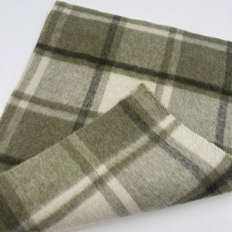 Dette stoffet, betegnet som artikkel ZZH25001, er et tykt vevd tekstil som består av 30 % ull og 70 % andre fibre. Med en masse per arealenhet på 900 g/m, viser materialet betydelig tetthet og vekt. Overflaten har et grønt rutemønster med en skyggeeffekt skapt gjennom spesialiserte veveteknikker. Denne konstruksjonsmetoden gir lagvis visuell dybde i rutenettformasjonen. Inkluderingen av ullfibre i blandingen påvirker stoffets termiske reguleringsegenskaper. Disse tekniske spesifikasjonene resulterer i et tungt vevd stoff som er egnet for strukturerte plagg der det kreves utpreget tekstur og betydelig tilstedeværelse.