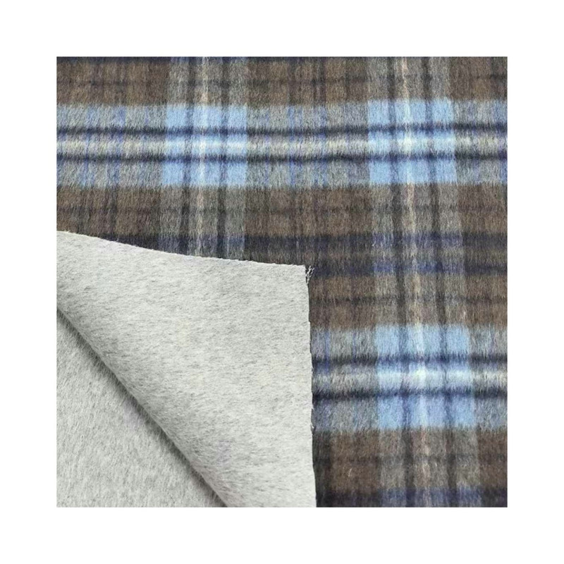 Dette stoffet, betegnet som artikkel ZZH25003, er et tungt vevd tekstil som består av 50 % ull og 50 % andre fibre. Med en masse per arealenhet på 950 g/m, viser materialet betydelig tetthet og vekt. Overflaten har et rutemønster som kombinerer blå og brune toner i en strukturert rutenettformasjon. Denne vektkategorien bidrar til stoffets vindmotstand og isolasjonsevne. Ullblandingssammensetningen påvirker tekstilets termiske reguleringsegenskaper. Disse tekniske spesifikasjonene gjør dette vevde stoffet egnet for vinterfrakker der det kreves betydelig beskyttelse mot kalde værforhold.