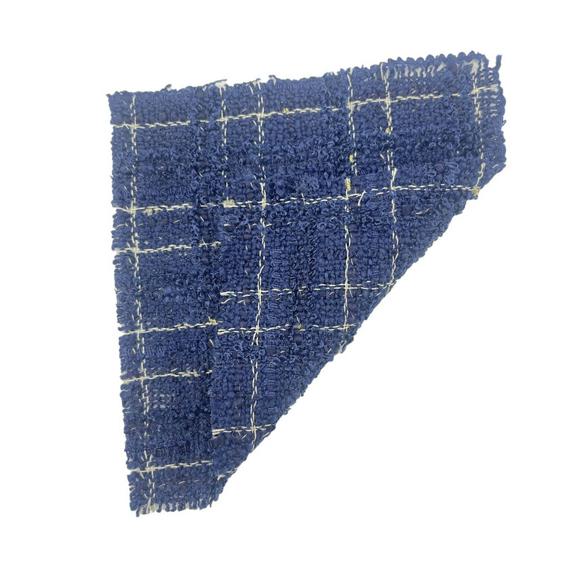 Dette stoffet, betegnet som artikkel 19909-10, er en 100 % polyester tweed designet for dameklær. Med en masse per arealenhet på 558g/m presenterer den en middels vekt struktur. Den mørkeblå basen er vevd med et rutemønster, integrert med metallisk garn under produksjonsprosessen. Denne kombinasjonen skaper en kontrast i både visuelle og taktile egenskaper. Hele polyestersammensetningen sikrer dimensjonsstabilitet og jevn ytelse. Inkluderingen av metalliske elementer tilfører lysreflekterende detaljer til tekstiloverflaten. Disse egenskapene gjør stoffet egnet for plagg der strukturell integritet og dekorativ effekt er prioritert.