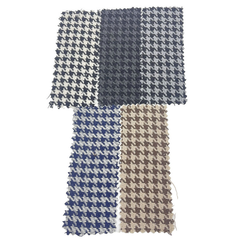 Dette stoffet, betegnet som artikkel 3946, er et vevd tekstil som består av 10 % ull og 90 % andre fibre. Med en masse per arealenhet på 450 g/m gir den en middels vekt konstruksjon. Den mørkegrå overflaten har et houndstooth-mønster, laget gjennom en spesifikk veveteknikk som produserer ødelagte ruter eller firspissede former. Dette klassiske geometriske motivet er preget av dets repeterende kontrasterende tonale effekt. Ullblandingssammensetningen bidrar til stoffets termiske regulering og spenst. Disse tekniske egenskapene resulterer i et materiale med definert mønsterartikulasjon og strukturell holdbarhet, noe som gjør det egnet for hettegensere der visuell mønsterdefinisjon og langsiktig ytelse er nødvendig.