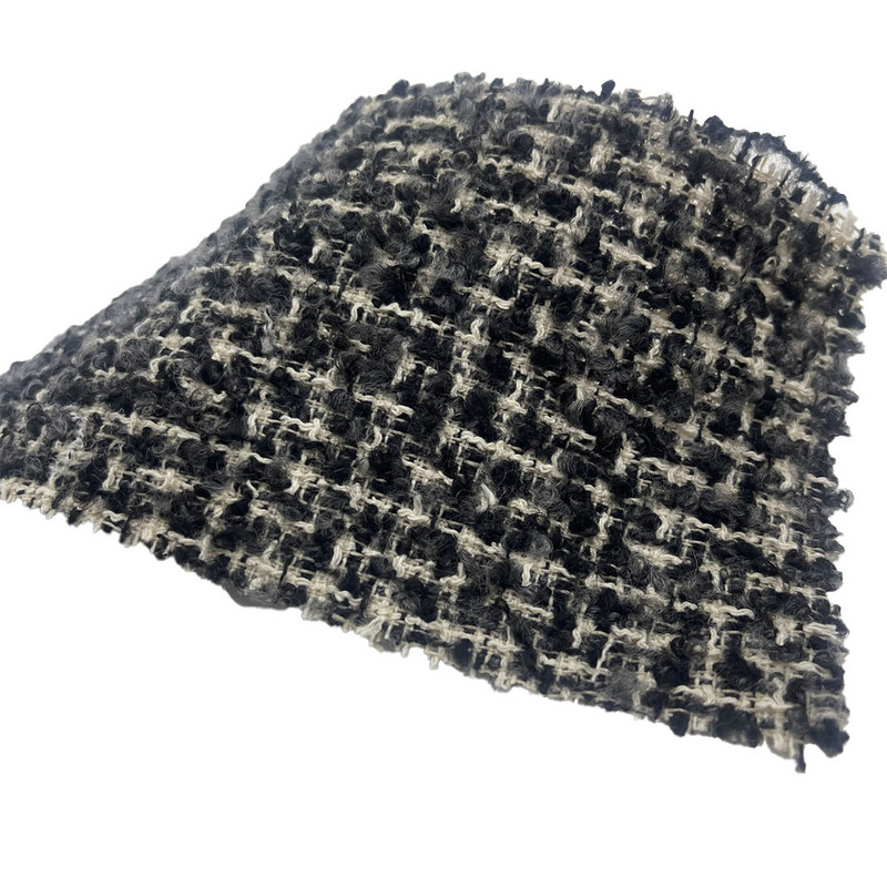 Dette stoffet, betegnet som artikkel 23515, er et tweedtekstil som består av 77 % polyester, 14 % bomull, 4 % ull, 4 % akryl og 1 % nylon. Med en masse per arealenhet på 420 gsm presenterer den en middels vekt konstruksjon. Overflaten har et preget mønster kombinert med en løkkegarnstruktur, noe som skaper en teksturert taktil effekt. Multifiberblandingen integrerer stabiliteten til polyester, fuktighetsabsorbering av bomull, naturlig karakter av ull, loft av akryl og forsterkning av nylon. Denne kombinasjonen resulterer i et stoff med overflatedimensjonalitet og strukturell integritet. Disse egenskapene gjør den anvendelig for plagg som krever både visuell tekstur og funksjonell holdbarhet.