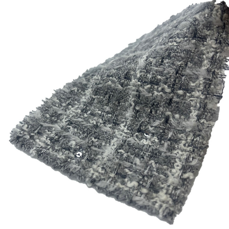 Dette stoffet, betegnet som artikkel 23503, er et tweed-tekstil som består av 49 % akryl, 40 % polyester, 7 % ull og 4 % nylon. Med en masse per arealenhet på 335 gsm presenterer den en lett, men strukturert konstruksjon. Overflaten har et fint grått rutemønster, oppnådd gjennom en pregeprosess som skaper en subtil forhøyet tekstur på stoffet. Denne teknikken forbedrer den visuelle dybden til plaiden uten å endre den vevde basen. Multifiberblandingen kombinerer stabiliteten til polyester, spensten til akryl, naturlig touch av ull og holdbarheten til nylon. Disse egenskapene gjør stoffet egnet for dameplagg der det kreves detaljert mønster og taktil interesse.