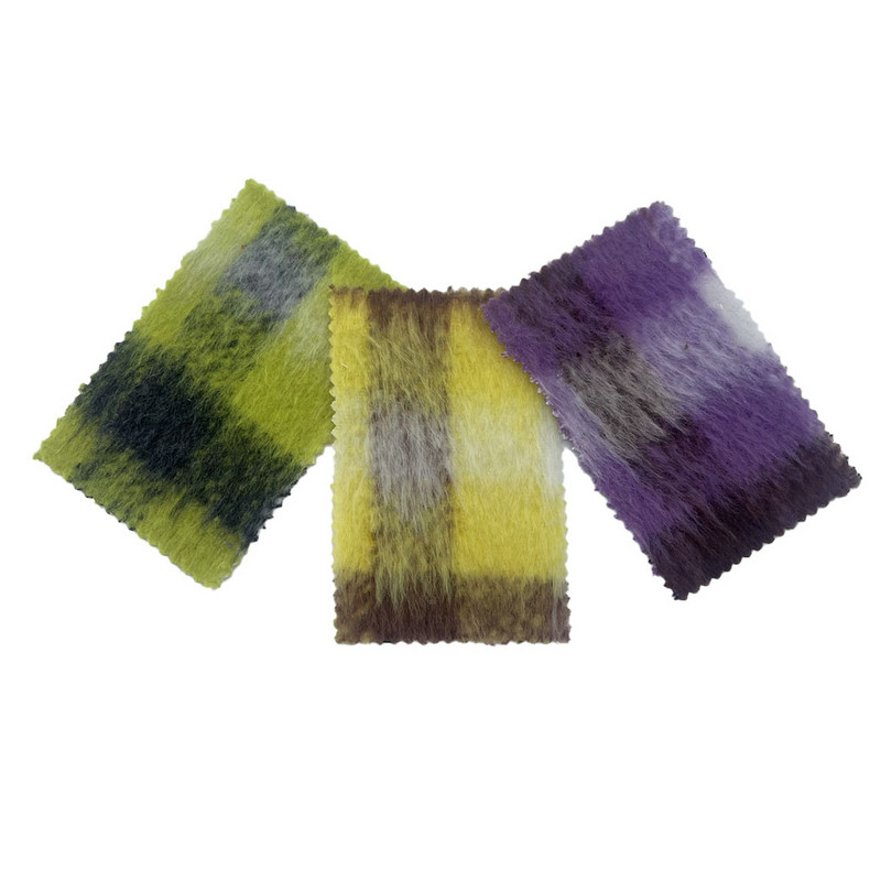 Dette stoffet, betegnet som artikkel 3256, er et tweedtekstil som består av 20 % ull og 80 % andre fibre. Med en masse per arealenhet på 700 g/m presenterer den en tungvektskonstruksjon. Den lilla overflaten har et rutemønster integrert med en lang luv-tekstur, og skaper en komposittstruktur gjennom spesialiserte veve- og etterbehandlingsprosesser. Denne produksjonsteknikken gir utvidet fiberlengde på overflaten, noe som resulterer i en uttalt tredimensjonal effekt. Ullblandingssammensetningen bidrar til stoffets varmeisolasjonsegenskaper og strukturelle spenst. Disse tekniske egenskapene resulterer i et materiale med betydelig volum og overflatedybde, noe som gjør det egnet for overfrakker der det kreves forhøyet varme og tekstur.