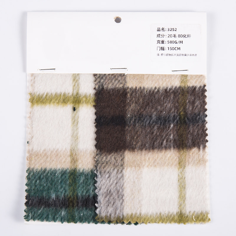 Smooth Hair Wool Polyester Heavyweight Fabric For Overcoats 3252 er et innovativt blandet stoff som kombinerer fordelene med ull og kjemiske fibre. Den er spesielt designet for plaggproduksjon som etterstreber både høy kvalitet og praktisk. Stoffet er presisjonsblandet av 20 % utvalgt ull og 80 % høyverdig kjemisk fiber. Dette vitenskapelige forholdet er designet for å maksimere fordelene med de to materialene. Ull er kjent for sin naturlige varme og pusteevne, som effektivt kan regulere kroppstemperaturen og opprettholde et behagelig bæremiljø, spesielt egnet for bruksbehov i kalde årstider. Tilsetningen av kjemisk fiber forbedrer stoffets rynkemotstand, slitestyrke og elastisitet betydelig, noe som gjør stoffet lettere å ta vare på samtidig som det opprettholder langsiktig morfologisk stabilitet. Stoffet har en tung design for å sikre tykkelsen og stivheten til stoffet, og gir god støtte og formingseffekter for pelsen, noe som gjør skjærelinjene mer jevne og tredimensjonale, og viser sofistikasjonen og elegansen til high-end klær. Den glatte og flate overflatebehandlingen forbedrer ikke bare følelsen og den visuelle effekten av stoffet, men forbedrer også bærekomforten og motefølelsen til klærne. I tillegg unngår blandingen av ull og kjemisk fiber effektivt manglene til rene ullstoffer som krymping og pilling, forbedrer holdbarheten og funksjonaliteten til stoffet, og forlenger klærnes levetid.