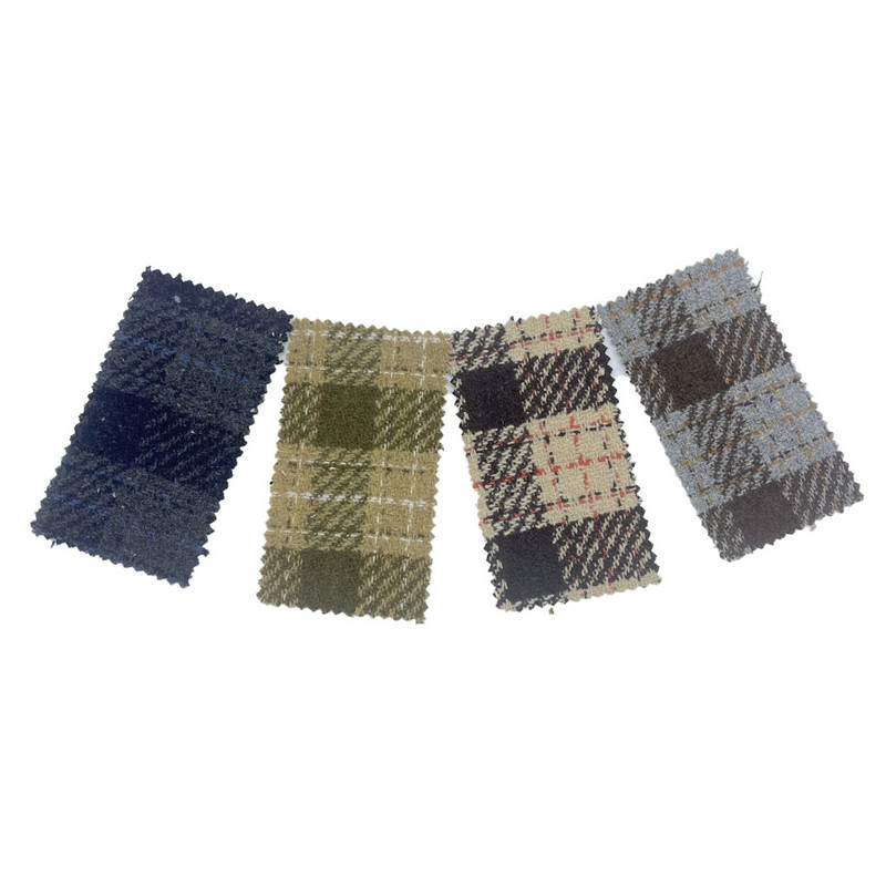 Dette stoffet, betegnet som artikkel 4144, er et jacquard-tweed-tekstil som består av 10 % ull og 90 % andre fibre. Med en masse per arealenhet på 550 g/m presenterer den en tungvektskonstruksjon. Den grønne overflaten kombinerer en twillvevd base med stripete rutete mønstre, skapt gjennom jacquard-prosessen som integrerer lineære bånd med rutenettformasjoner. Denne teknikken produserer kryssende mønstre over den karakteristiske diagonale kyperteksturen. Ullblandingssammensetningen bidrar til stoffets dimensjonsstabilitet og holdbarhet. Disse tekniske egenskapene resulterer i et materiale med flerlags mønster og strukturell tetthet, noe som gjør det anvendelig for klesplagg der komplekse designelementer og stoffets elastisitet kreves.